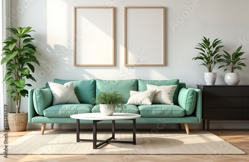 Stylish Scandinavian living room, dining area features mint green sofa with cream colored pillows. Empty photo frames on wall add modern touch. Plants in white pots, elegant accessories complete