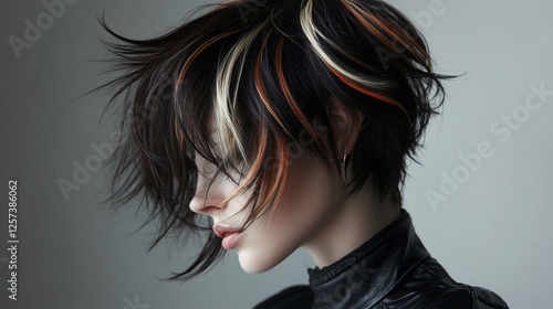 Stylish short hair, studio shot, color highlights, textured, beauty