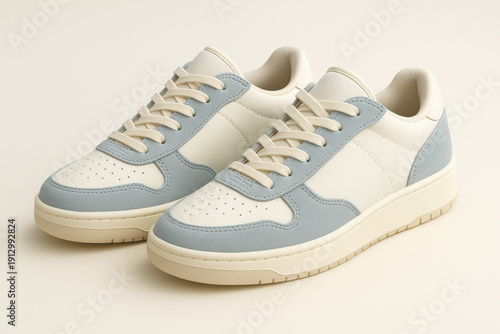 Stylish sneakers in pantone ice melt and cloud dancer colorway, clean minimal design, modern casual footwear product render on light background