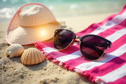 Stylish sunglasses resting on a sun-drenched beach towel, next to seashells and flip-flops, ready for a day of sun and fun Perfect for summer vacation themes , summer vacation, heat