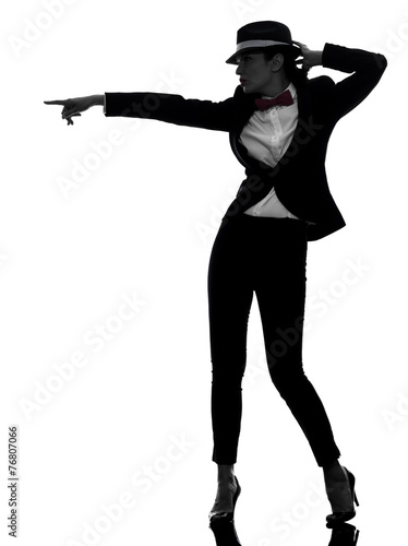dancer, dancing, isolated, people, silhouette, woman, backlit, clothes, costume, costume, elegance, elegant, full-length, hat, 1, profile, shadow, studio, tuxedo, white background