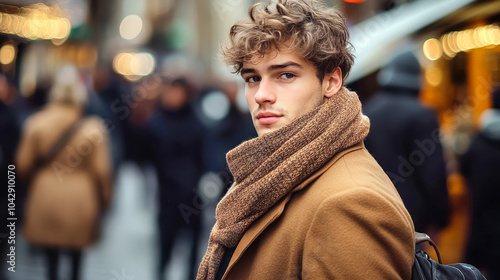 young, man, stylish, coat, foulard, city, street, urban, life, winter, fashion, portrait, model, blurred, background, pedestrian, fashionable, wavy, hair, clothes, sleek, shiny, vibrant, confident, bustling, modern, lifestyle, distinct, feature, youthful, downtown, casual attire, chic, trendy, male, setting, expressive, pose, perspective, character, ambience, city landscape, relaxed, natural, light, candid