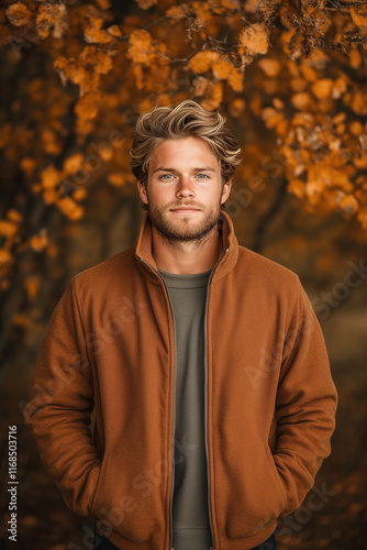 man, young, photogenic, person, model, casual attire, guy, stylish, outdoors, autumn, fall, park, orange, jacket, caucasian