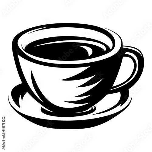 Stylized black and white cup of coffee on saucer illustration