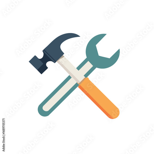 hammer, wrench, tool, repair, construction, building, hardware, instrument, mechanical, equipment, engineering, bricolage, fix, illustration, design, graphic, icon, symbol, object, metallic, workshop, maintenance, renovation, project, work, tool kit, industry, metalwork, utility, crossed, creative, simple, clean, modern, flat, vector, blue, orange, teal, white