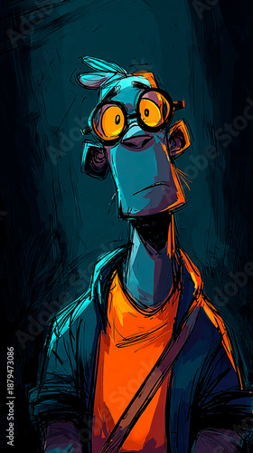 Stylized digital illustration of a man with round glasses and a thoughtful expression. Artistic character design with vibrant orange and teal lighting on a dark background. Moody portrait in a modern