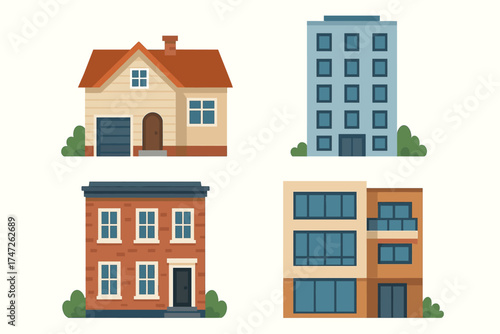 Stylized illustrations of different types of residential buildings