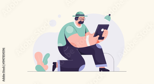 man, earphones, tablet, kneeling, outdoors, plant, stylised, illustration, character, digital, technology, connection, online, communication, information, learning, entertainment, browsing, searching, datum, device, contraption, screen, interactive, modern, trendy, creative, graphic, design, art, flat, vector, simplified, person, adult, male, individual, lifestyle, leisure, relaxation, focused, absorbed, engrossed, captured, engaged, interested, curious