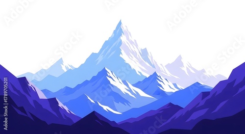 Stylized mountain range vector illustration, blue-purple tones, snow-capped peaks, white sky backdrop.