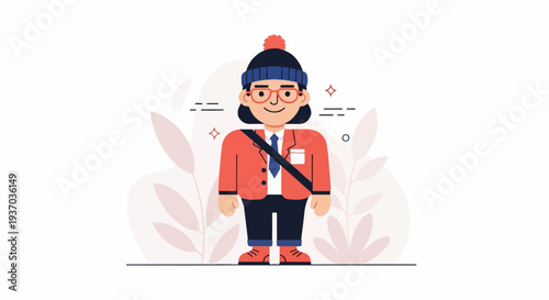 person, stylised, winter, hat, goggles, suit, attaching, jacket, pant, shoe, bag, strap, cheerful, smiling, happy, isolated, simple, flat, illustration, graphic, design, character, minimal, clean, modern, icon, cartoon, digital, art, people, lifestyle, style, outfit, attire, clothing, accessory, headwear, eyewear, formal, casual attire, fashionable, vibrant, colours, background, decorative, organic, shape, playful, friendly
