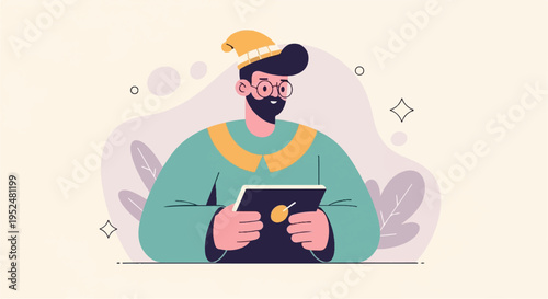 illustration, man, person, character, digital, tablet, holding, beard, goggles, hat, yellow, teal, pink, purple, pastel, flat, graphic, modern, abstract, background, creative, design, art, icon, cartoon, simple, clean, friendly, professional, business, technology, information, communication, learning, education, cognition, idea, inspiration, sharpened, concentration, engagement, connection, creativity, workspace, desk, study, work, browsing, scrolling