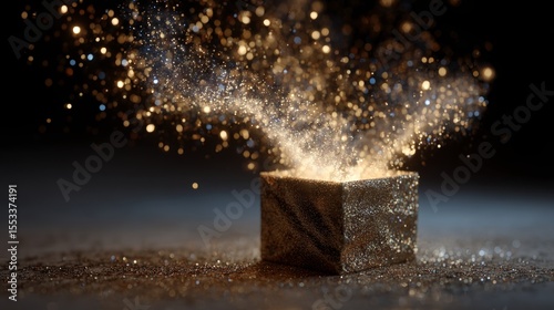 Stylized photo of a levitating gift box mid-motion as it opens with magical sparkle. A bright burst of glittering confetti and sparkles shoots outward, fading into floating particles, magical scene.