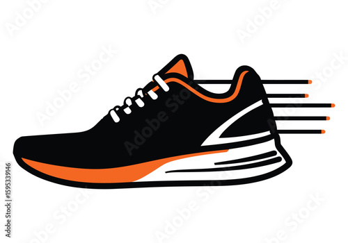 running shoe, sneaker, sport, footwear, illustration, graphic, motion, orange, black, white, athletic, design, icon, symbol, clip art, exercise, fitness, active, modern, style, running, fast, movement, racing, training, performance, marathon, jogging, speed, dynamic, lifestyle, health, energy, iconic, drawing