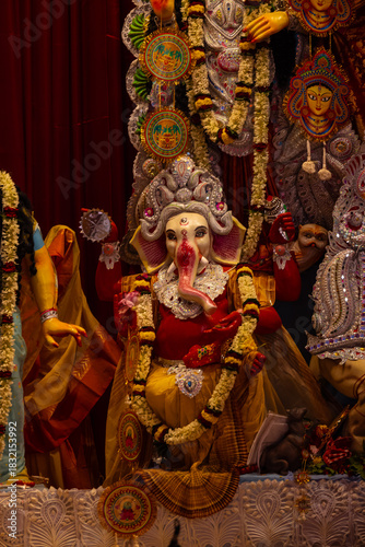 Subho mahalaya, An idol of hindu god Ganesh decorated in Pandal. Durga Puja is biggest religious festival of Hinduism and for bengalis and is now celebrated.