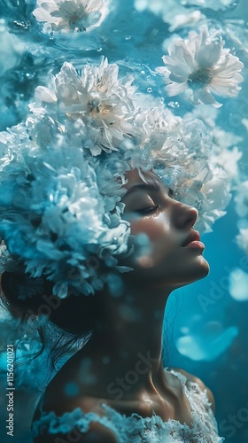 woman, underwater, floral, crown, flower, beauty, serenity, calmness, aethereal, peaceful, underwater photography, portrait, art, dreamy, elegant, delicate, nature, still life