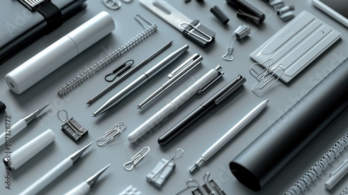 Subtly incorporates everyday stationery items as pens and paper clips. top view. Generative AI.
