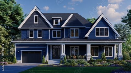 Suburban Blue House with a Front Porch