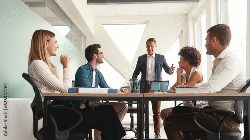 Successful team. Handsome and cheerful mature business man in formal wear discussing something with his colleagues and smiling while working together in the office