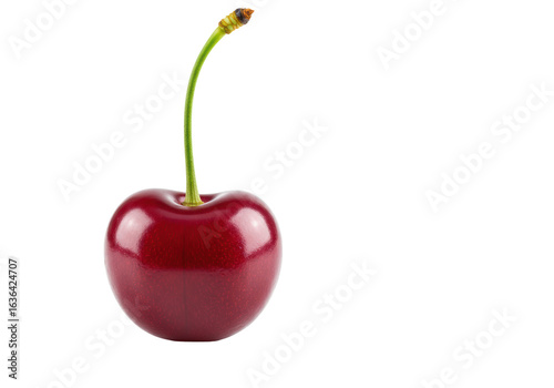 Succulent deep crimson cherry with vibrant green stem, subtle reflections, in sharp macro shot on transparent studio background. Concept of perfection