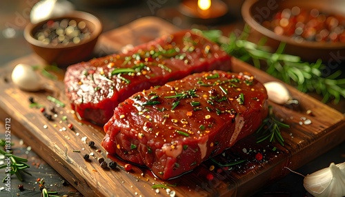 Succulent Raw Beef Steaks Marinating in Rich Spices and Fresh Herbs, Artfully Arranged on a Rustic Wooden Board, Signifying Gourmet Meal Preparation