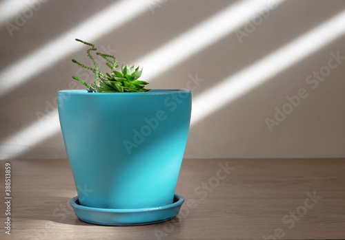 Suculent plant in a blue pot in daylight. Houseplants in a minimalist style.