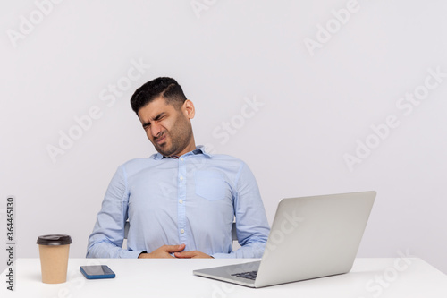 Sudden stomach ache at work. Unhealthy man employee sitting in office, suffering heartburn, gastrointestinal disorder, symptoms of constipation indigestion. studio shot isolated on white background