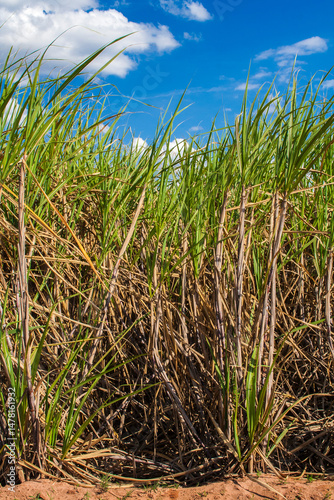 Sugar cane field and blue sky on the farm in Brazil