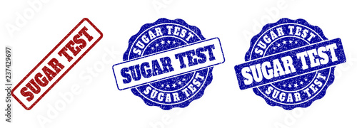 SUGAR TEST grunge stamp seals in red and blue colors. Vector SUGAR TEST labels with dirty style. Graphic elements are rounded rectangles, rosettes, circles and text labels.