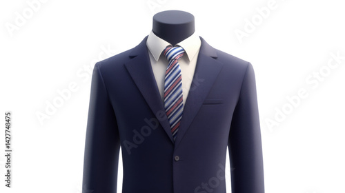 Suit on mannequin with striped tie and white shirt in studio shot.