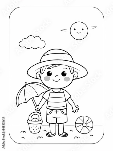 summer beach scene coloring page features a cheerful kid with a bucket and an umbrella, perfect for children to enjoy a fun and creative activity. Ideal for summer camps, beach parties, or a relaxing