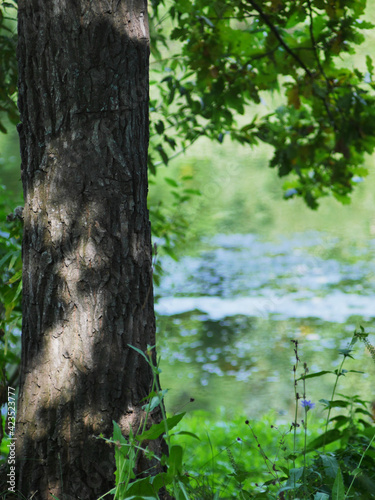 Summer blurred background with a tree near the pond, rich green foliage.