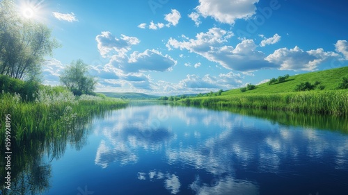 Summer Landscape with Green Hills, Calm River, and Sunny Sky landscape sky sunny green summer calm