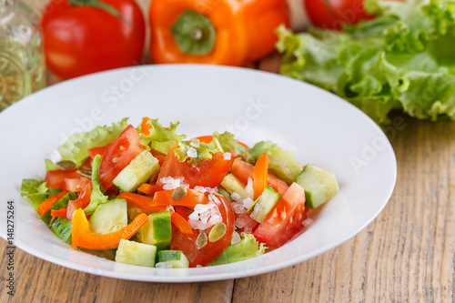 Summer light air salad of fresh vegetables on a wooden background. Still life in a rustic style.