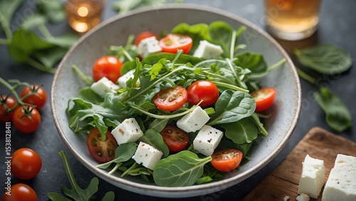 Summer salad with arugula, spinach, cherry tomatoes, and feta cheese. Food background top view with empty space for text.