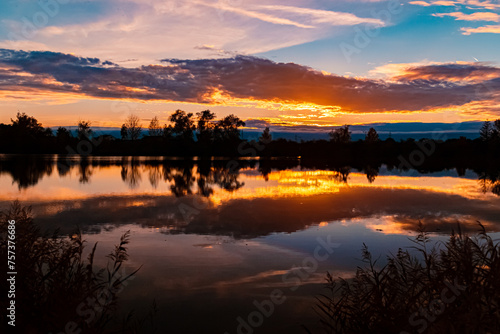 Summer sunset with reflections near Aholming, Deggendorf, Bavaria, Germany