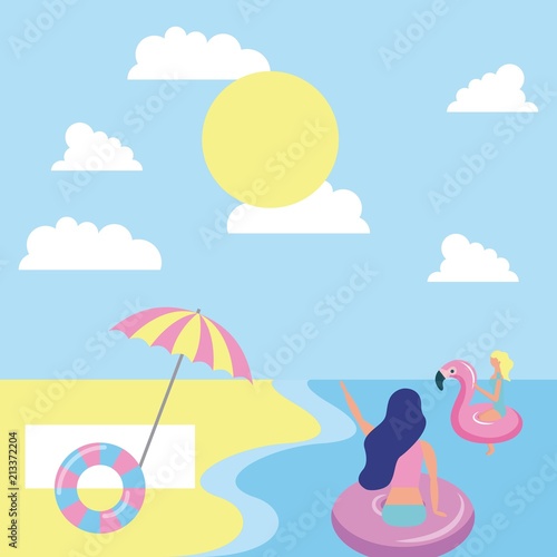 summer, vacation, water, fun, cloud, sunny, day, umbrella, girl, sea, flamingo, float, vector, illustration, relax, time, travel, happy, freedom, activity, lifestyle, friendship, female, group, pool, love, relaxation, culture, back, adventure, background, together, togetherness, tour tourism