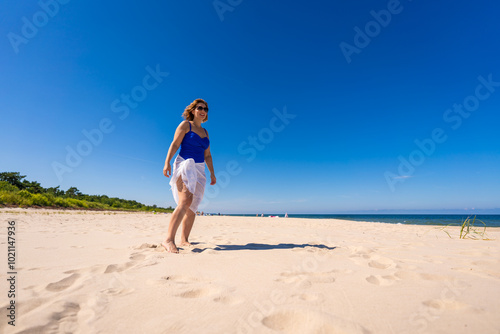 woman, beach, vacation, walking, holiday, sun tanning, middle-aged, girl, young, female, swimwear, swimwear, middle-aged, mid-adult, model, walk, lifestyle, leisure, sandy, woman, coast, sea, sunbathe, tan, holiday, vacation, beautiful, sunny, happy, summer, summer, 1, person, blue, caucasian, people, sky, sand, white, travel, holiday maker, front view, beauty, sarong