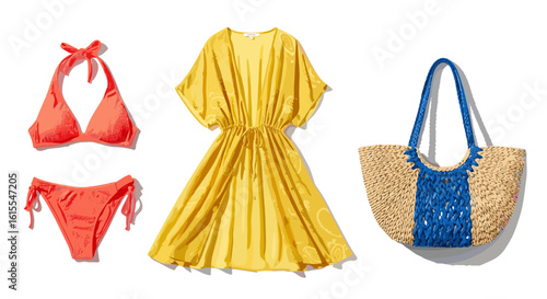 Summer vacation essentials: Stylish bikini, cover-up, and straw tote bag.