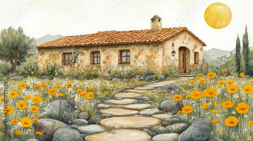 tranquil, sunshine, serene, foliage, watercolor, country, sun, card, tree, roof, door, rural, house, rock, path, chimney, farmhouse, rustic, pathway, drawing, hideaway, scene, summer, artwork, idylli, quaint, print, window, bungalow, exterior, poppy, tile, retreat, countryside, landscape, nature, green, peaceful, grass, flower, stone, flora, daylight, yellow, building, garden, painting, poster
