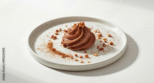 dessert, treat, indulgence, sweetness, decadence, epicure, chocolate, mousse, nut, crunch, plate, minimalism, food, snack, delicious, cream, taste, cocoa, favor, sugar, pastry, baking, garnish, white, closeup, fresh, texture, luxury, cookery, meal, portion, sweet, rich