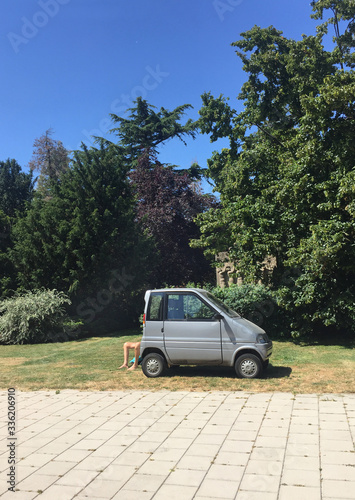 recreation, car, vegetation, tree, travel, sun tanning, summer, relaxed, relax, pavement, outdoors, nature, leg, grass, environment, daylight, blue skies, automobile, vehicle