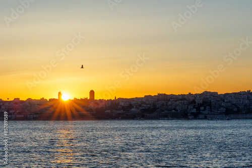 Sun between the skyscrapers at sunset over İstanbul near Bosphorus