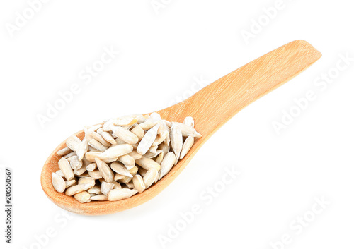 Sun flower seed on wood spoon isolated on white background