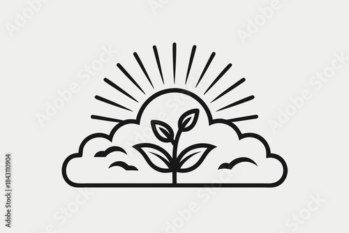 curved, sun, ray, cloud, germ bud, minimal, vector, icon, weather, sunny, germinating, plant, growth, nature, eco, sky, day, line, fresh, environment, botanical, green, cheerful, outline, simple, symbol, lifestyle, season, sunlight