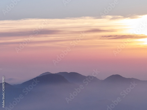 Sun set in Taiwans mountain region - Alishan mountain sun set in warm pastel colors with fog between mountain ranges