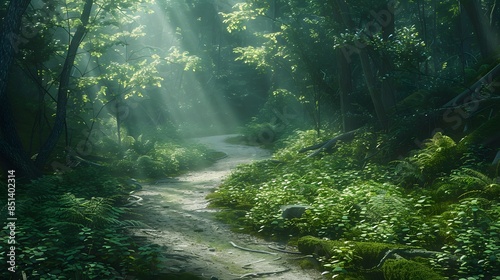 Sunbeams Filtering Through a Forest Path