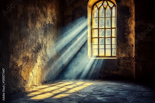 Sunbeams illuminate a dark, ancient room through a Gothic window