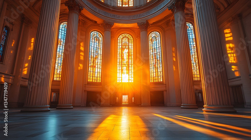 Sunbeams illuminate a grand hall's stained glass windows and marble columns, creating a radiant atmosphere