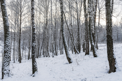 Sunbeams shining through snow-covered birch branches in a birch forest after a snowfall on a winter.