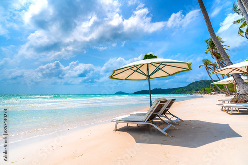 Sunbeds under tropical palms on beach on Phu Quoc island, Vietnam. Beach's smile